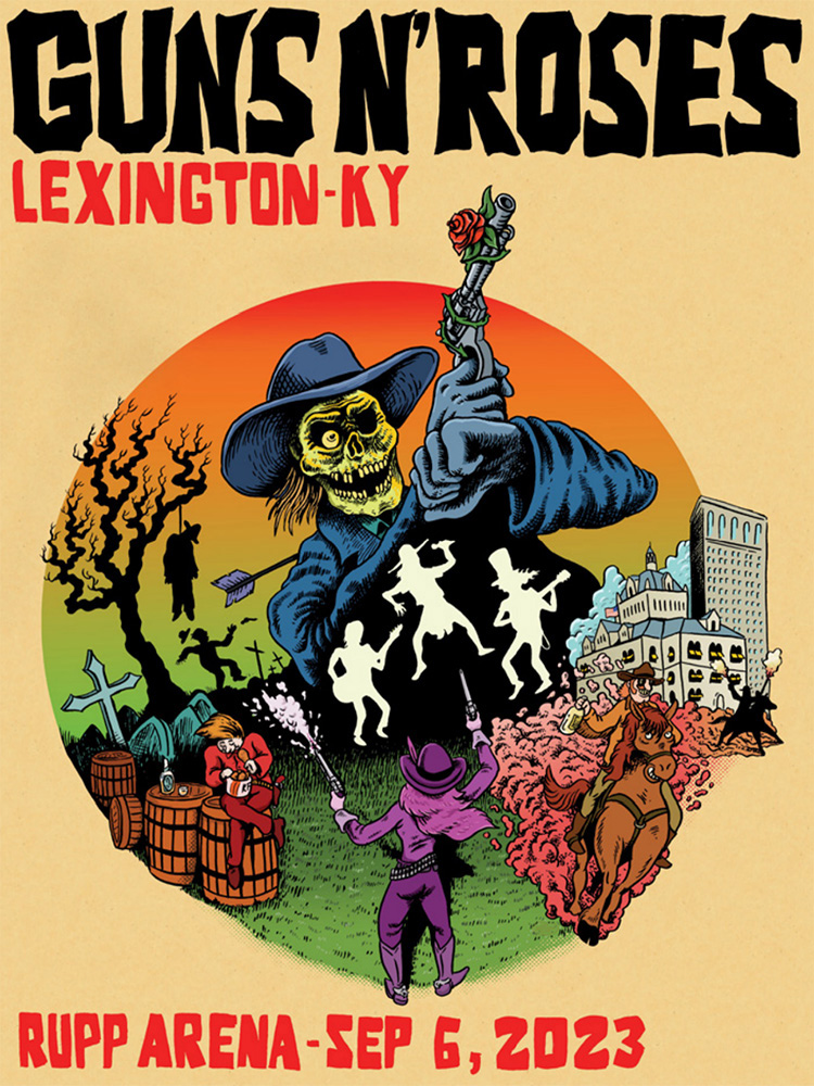Courthouse. The figure eating the chicken is modeled after the highlighted figure from the cover of the 'Use Your Illusion' albums. The overall composition is an homage to the theatrical film poster for the 1967 Lee Van Cleef western 'Death Rides a Horse'. |