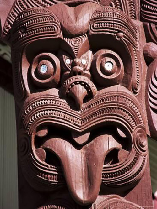 Reference: The facial tattoos, attire and expression are all traditional images which represent the Māori people of New Zealand.